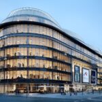 • A modern, hourglass-shaped building with a hexagonal pattern illuminated in an evening urban setting.
